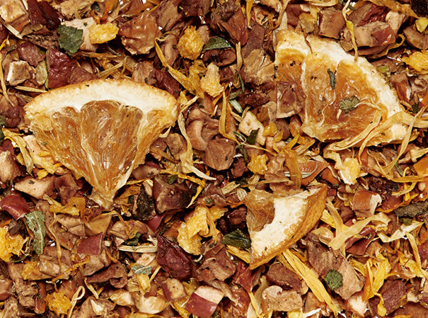 Ingrediënten: appelstukjes, sinaasappelschijfjes, natuurlijk aroma, gevriesdroogde mandarijn-sinaasappelstukjes, goudsbloembloesem, wilde aardbeiblaadjes